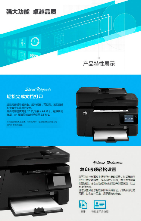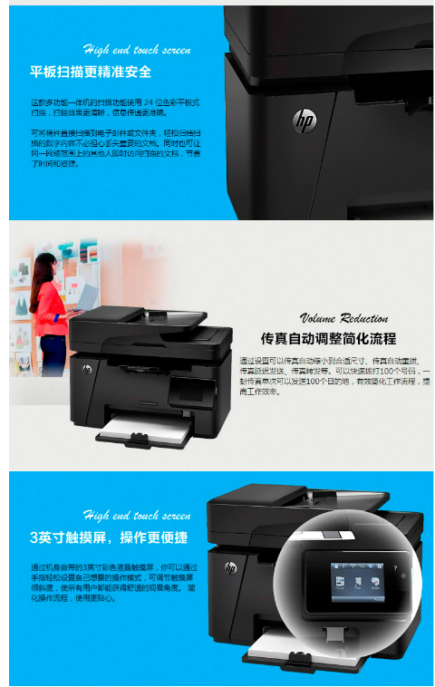 參數(shù) [商品名稱] 惠普HP LaserJet Pro MFP M128fp [打印功能] 非自動(dòng) [連接方式] 有線,USB [雙面類型] 支持輸稿器 [黑白最大支持幅面] A4紙 [掃描功能] 平板式+饋紙式 [基礎(chǔ)功能] 打印,復(fù)印,掃描,傳真