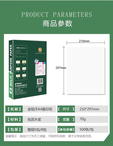 參數 [品牌] 晨鳴 [型號] 70克A4-5包 [毛重] 11.5kg [產地] 中國大陸 [單位] 箱